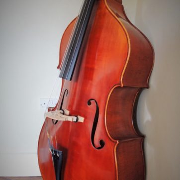 A fine hybrid bass with solid spruce top, flamed laminated sides and swell back. This bass bows well like a solid carved bass but with more focus towards clarity in pizzicato. This bass can be a great work horse for a professional jazz bass player seeking a more focus and fundamental tone.